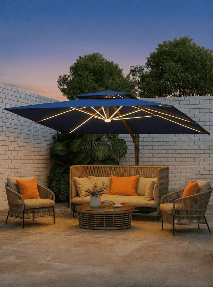 A estrutura em alumínio garante resistência e durabilidade, enquanto o sistema de iluminação LED integrado transforma seu espaço ao ar livre em um ambiente acolhedor mesmo após o pôr do sol. O tecido com tratamento repelente à água protege contra chuvas leves, mantendo você e seus convidados sempre confortáveis.